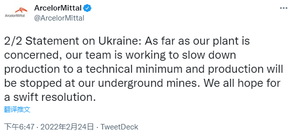 俄羅斯突襲烏克蘭!鋼廠紛紛停產(chǎn),運(yùn)輸中斷!安塞樂(lè)米塔爾:將最大限度減產(chǎn)!日本制鐵:尋找鐵礦石替代來(lái)源 以防俄烏沖突導(dǎo)致供應(yīng)中斷!